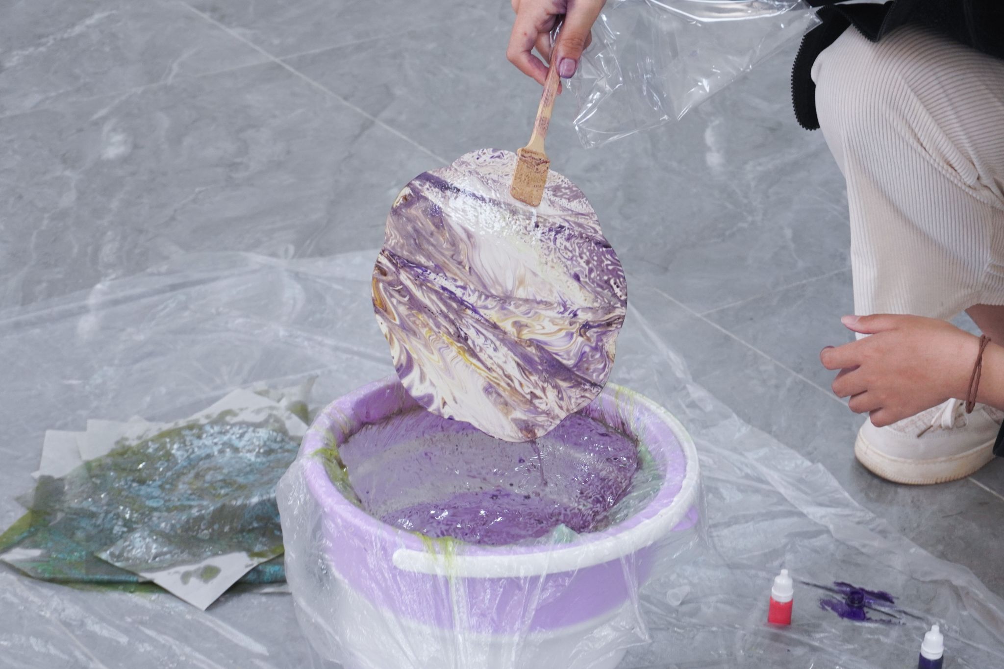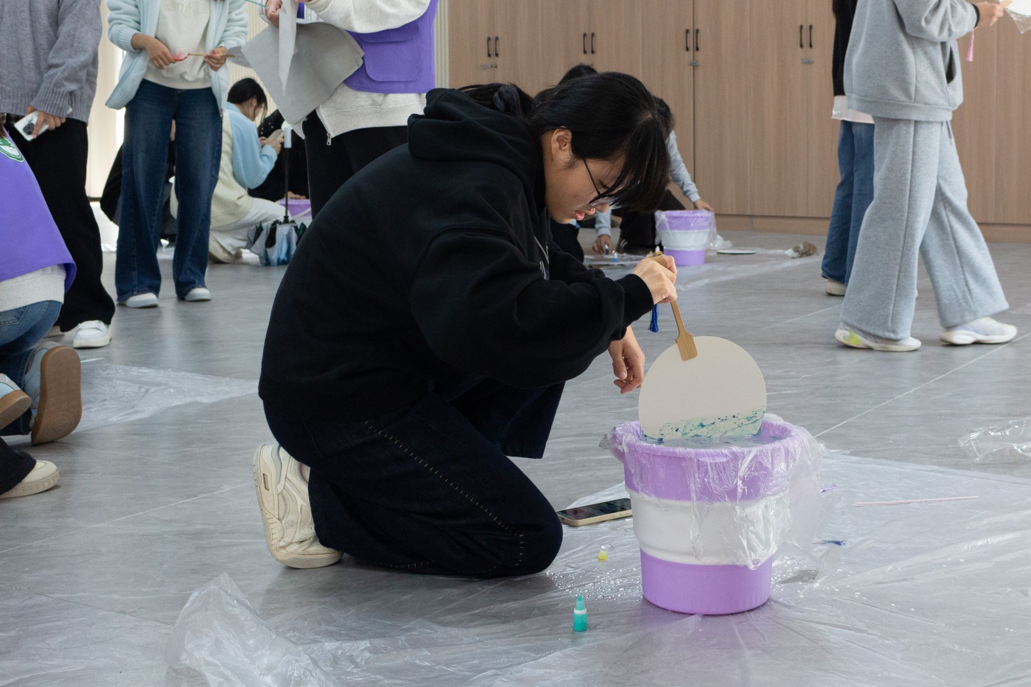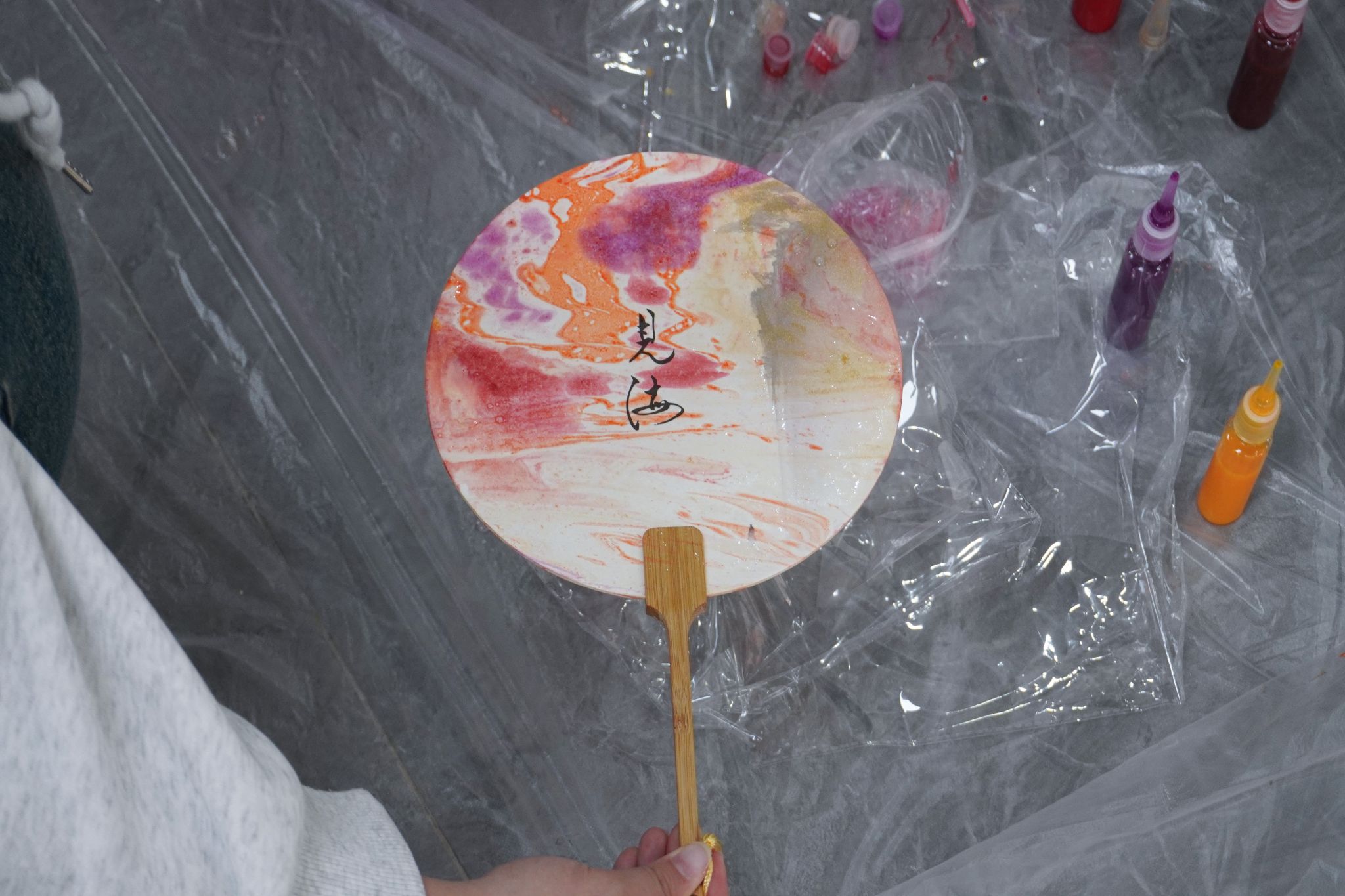 素面竹扇是待填色的留白,天然漆料是时光沉淀的色彩——当这些带着传统质感的材料铺展在地面,同学们便在亲手晕染中开启了“让古扇焕新”的创意体验。