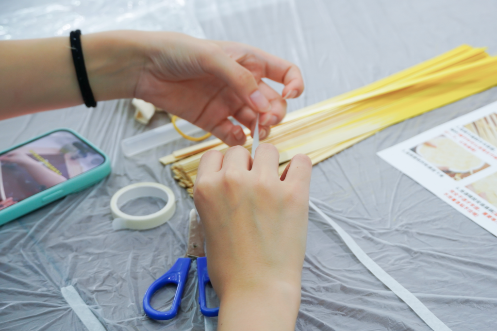 活动伊始,工作人员提前布置好充满雅韵的活动场地,并将竹篾、竹柄等制作材料整齐摆放。同学们陆续抵达后,在工作人员的引导下完成签到并领取材料包,有序落座。