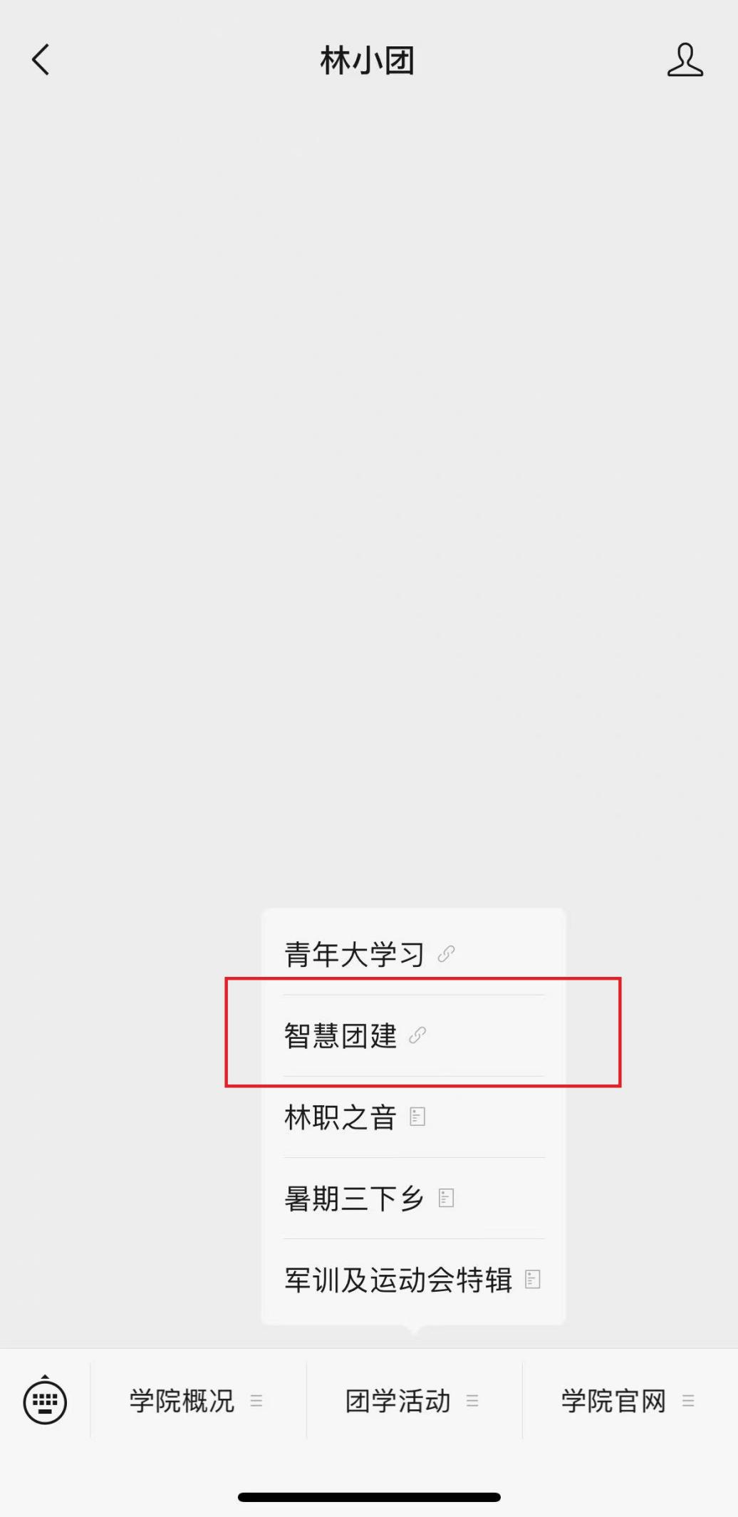(2)进入公众号,点击菜单栏——团学活动——智慧团建