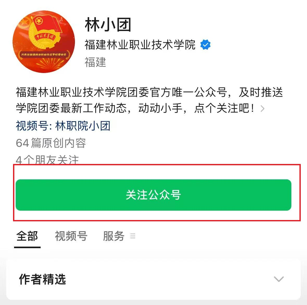 (1)微信搜索“林小团”(此为福建林业职业技术学院团委官方公众号)点击关注公众号