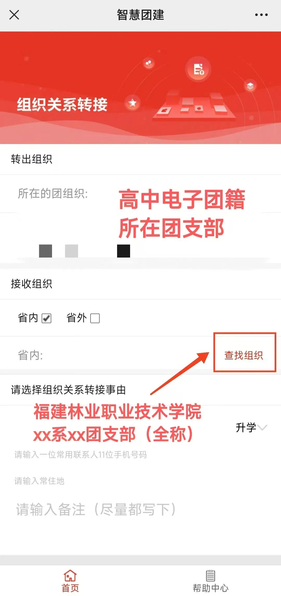 ④申请转入组织:选择团福建省委-福建林业职业技术学院团委-福建林业职业技术学院xx系xx团支部(具体转入团支部名称见详表)。