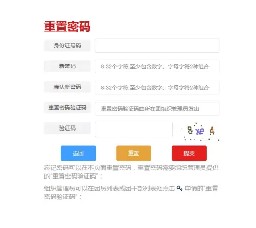 (2)若是首次登录会提示修改密码,若遗忘密码,在登录页面点击“忘记密码”并联系原团支部管理员生成“重置密码验证码”随后填写下图内容提交即可重新找回密码。