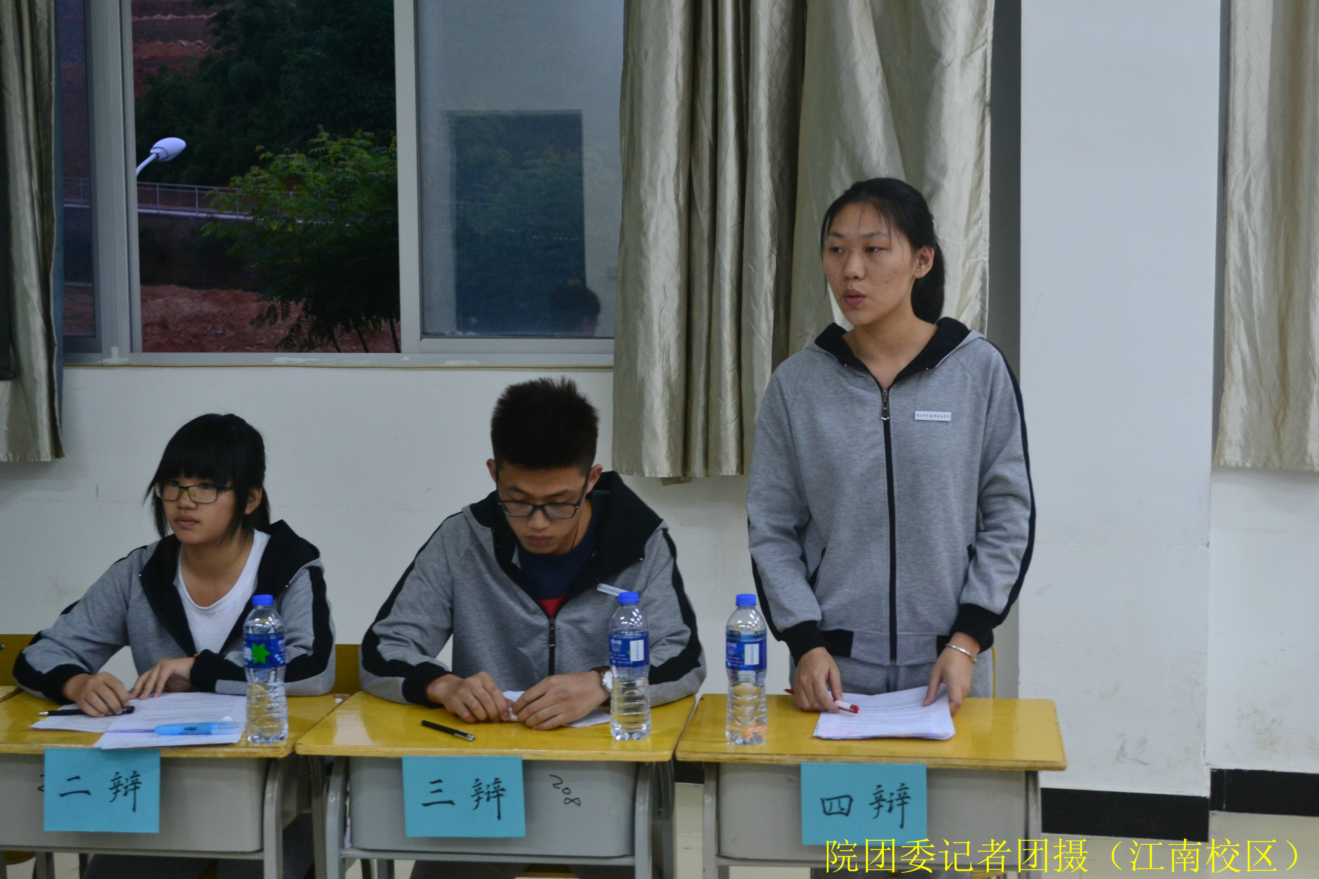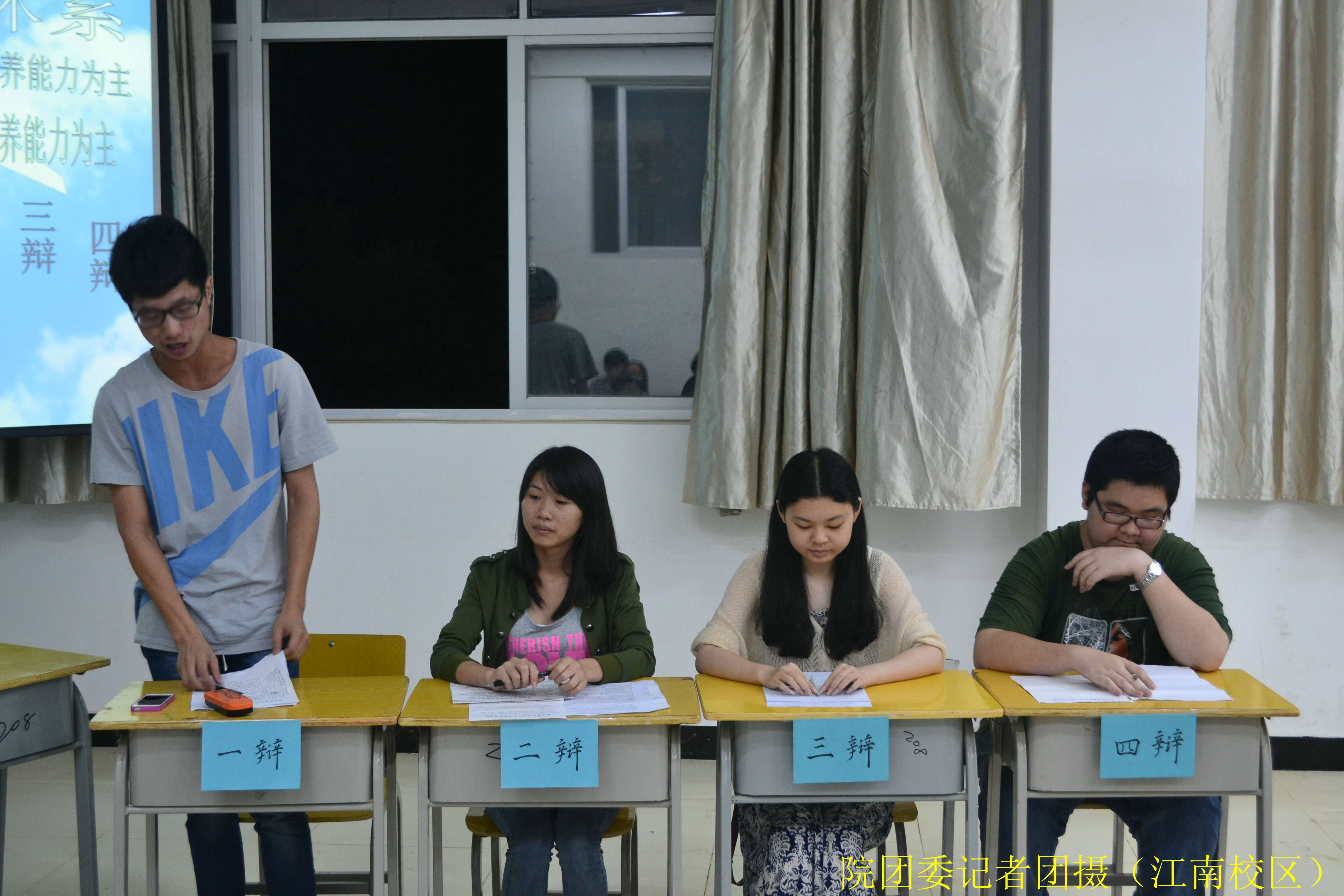 5月22日下午18点整,由院团委主办,院学习部承办的2014年“青春思辨”大学生辩论赛在我院江南校区实训四208室隆重开赛。本次比赛特别邀请了资源环境系辅导员王梦妮老师、土木工程系辅导员陆晓莉老师和园林系辅导员廖素梅老师作为评委。