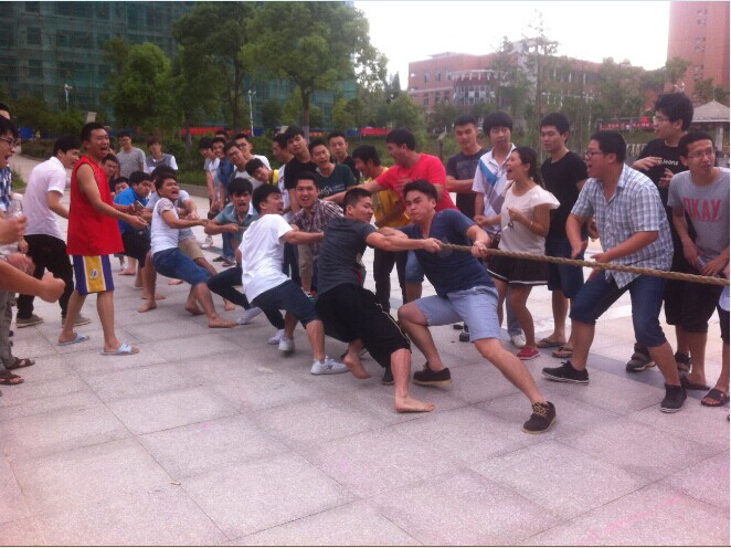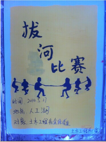 为全面贯彻落实党的十八届三中全会关于“强化体育课和课外锻炼,促进青少年身心健康、体魄强健”的精神,增强大学生体质、促进大学生健康成长。近日,共青团中央、教育部、国家体育总局、全国学联联合下发通知,决定从2014年开始,在全国高校范围内全面启动和广泛开展大学生“走下网络、走出宿舍、走向操场”主题群众性课外体育锻炼活动。为此土木工程系团总支组织策划举行“青春的活力”拔河比赛。按照比赛规定,每班选出10名学生,以年级组为单位展开竞赛。