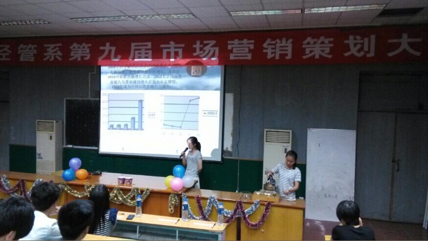 2014年5月21日晚上19点30分,由经管系团总支主办,经管系学习部承办的“第九届市场营销策划大赛”在第一多媒体如期举行。经初赛和复赛的激烈角逐后,有8队组合脱颖而出,进入今晚的决赛。本次大赛主要以营销目标、营销策略、广告策略等7个方面进行评比。选手们结合专业知识,充分发挥创新思维,从自己敏锐独特的视角捕捉市场信息,策划营销方案。其中有现场为我们带来以茶具实物来展示的、有慷慨激昂演讲的、也有以感动小短片来演示的,可谓是花样百出。本次大赛不仅为我系学生提供了一个实践的平台,也充分展示了我系学生的策划能力和风采,丰富了课余生活,进一步促进了我系学生积极参加实践活动。