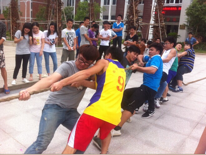 活动现场,双方队员紧紧抓牢手中的绳子,齐心协力往后拉。热情的啦啦队在场外高喊着“加油!加油!”震耳欲聋的声音此起彼伏。在这紧张时刻,队员们咬紧牙关,使尽全力,奋勇拼搏。有的队员手和脸都拉得通红,有的身体倾斜就快躺到地上去,有的眼眶都湿润了,可是仍然含着泪,咬着牙,坚持着,丝毫不松手。每一个年级、每一个班级的参赛队均全力以赴,赛出了顽强的精神、团结的风尚!场场比赛牵动着老师们的心,学校领导、辅导员老师、任课老师纷纷在旁加油助威,呐喊声中,师生融为一体,师生的心贴得更紧了……