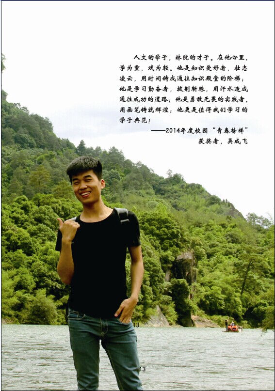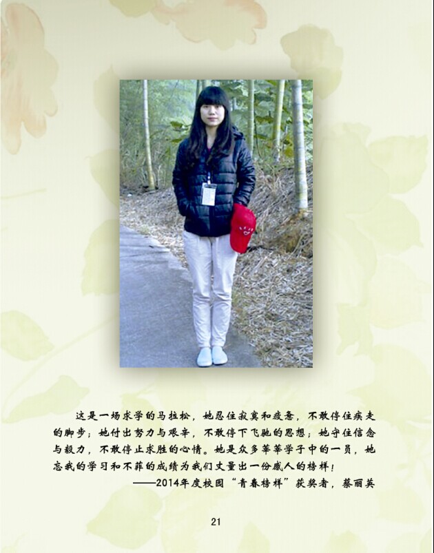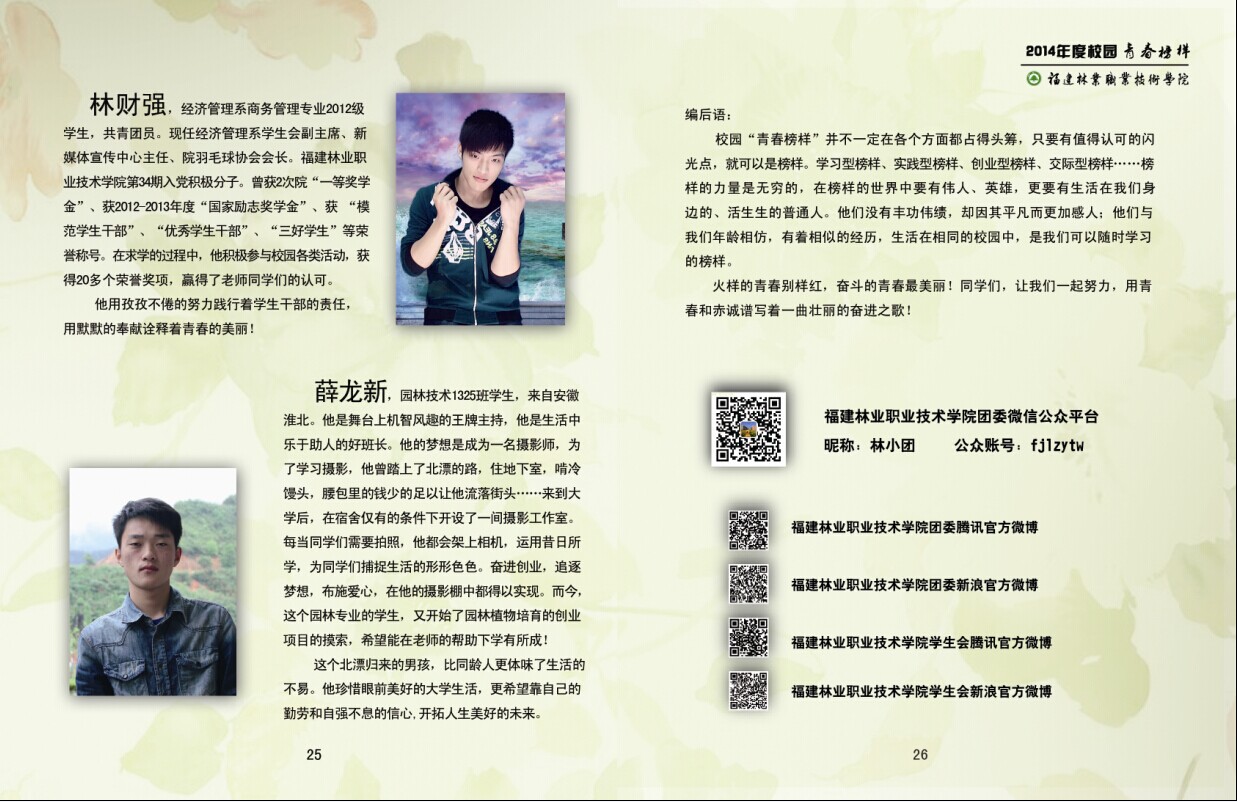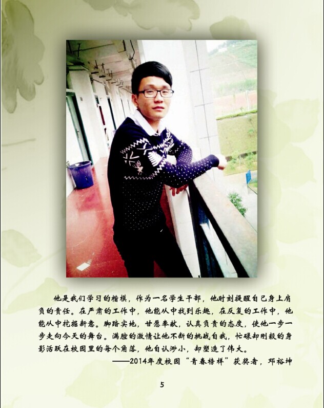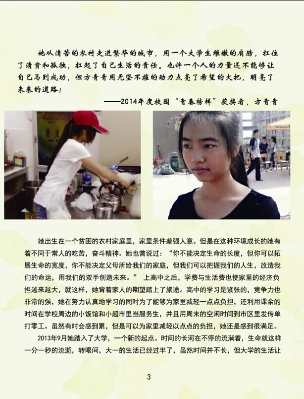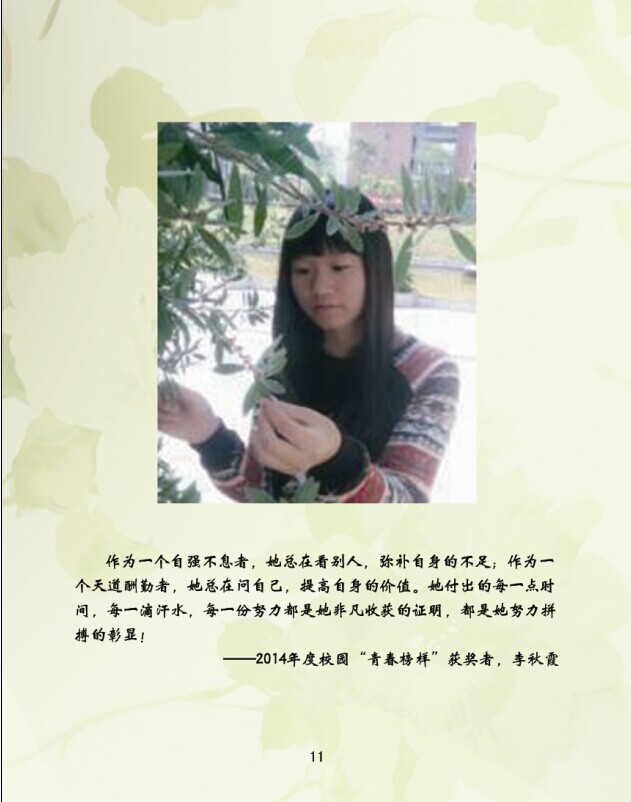 为大力推进我院学生思想教育工作,以身边榜样引领学生成长成才,展现我院学生自强不息、奋发向上的精神风貌,发挥榜样示范作用。2014年3月,院团委启动“青春榜样”人物评选活动,在全院范围内掀起了一股发现校园里的美——寻找校园“青春榜样”热潮。通过校园“青春榜样”评选,在广大学生中充分发掘奋发进取、无私奉献的典型人物,发现校园里的美,以先进的事迹感染人、以进取的精神激励人、以身边的榜样引导人,充分展示我院学生风采,为实现学校持续、健康、有序、高效发展提供强大的精神动力。