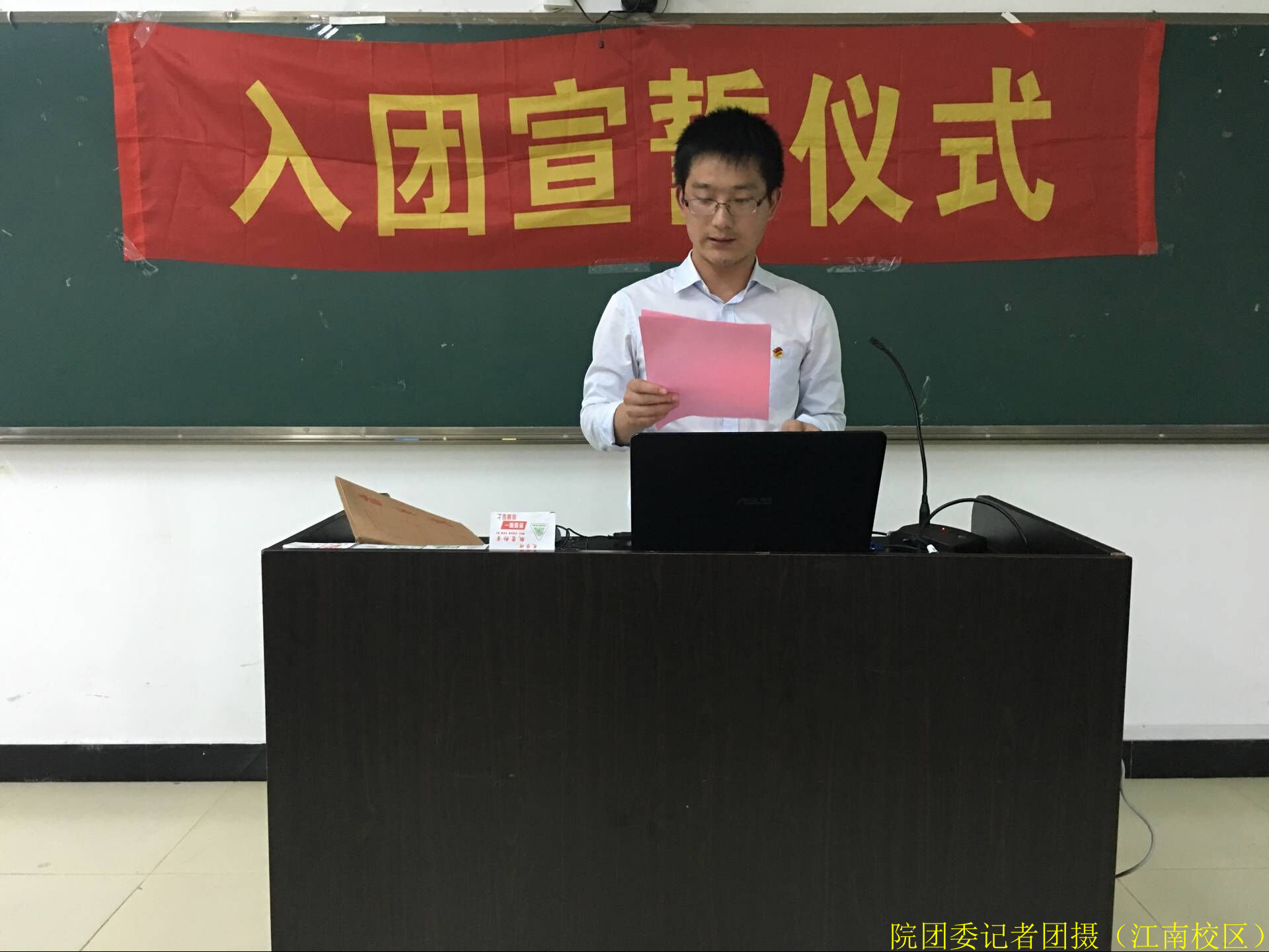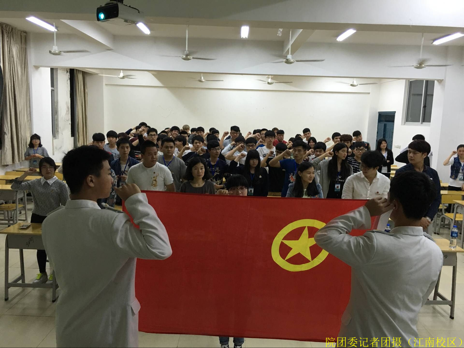 2016年4月20日晚上7点,院团委在江南校区实训四410举行了2015-2016学年第二学期入团宣誓仪式。团委叶新颖老师、交通工程系陆晓莉老师、园林系廖素梅老师出席了此次仪式,出席此次仪式的还有老团员代表团委副书记郭小玲同学、建筑工程系金延坚同学、交通工程系林晓波同学、林学系曾冬梅同学、园林系许志旭同学、中职部学生会主席许雯烨同学以及46名新发展团员。