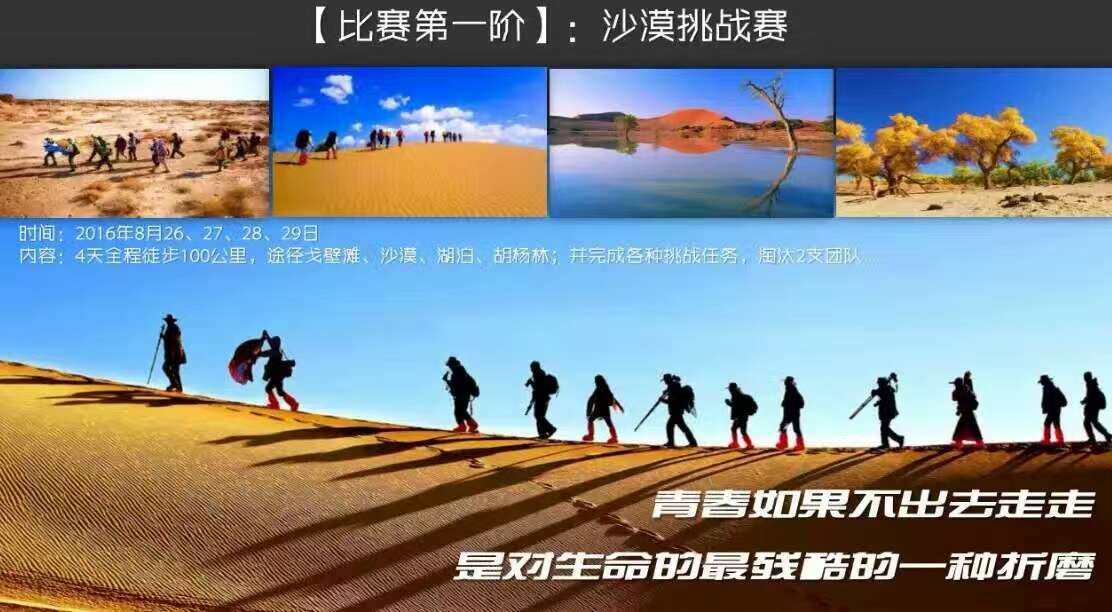本次大赛从2016年4月--9月,共经历了六个阶段:启动新闻发布会及校园宣传、海选入围赛、选手集训、沙漠挑战赛巅峰对决、颁奖大会。大赛覆盖北京、上海、南京、西安、成都、郑州、广州、南昌、天津、合肥、武汉、福建、新疆等20个城市的1000多所院校。大赛从报名的大学生中海选出 5000名选手进行入围营销实战赛,胜出25名选手分成5个团队,然后到达新疆塔克拉玛干大沙漠指定区域,进行4天3夜全程100公里徒步挑战赛,胜出3 支团队飞往北京、上海、深圳三个不同城市,进入商战巅峰总对决,决胜冠亚季军团队。冠军奖获得10万创业奖励、亚军获得5万创业奖励、季军获得3万创业奖励。据悉,本次大赛将在全国高等院校全面展开,大赛已经吸引全国1000所院校参与关注。
