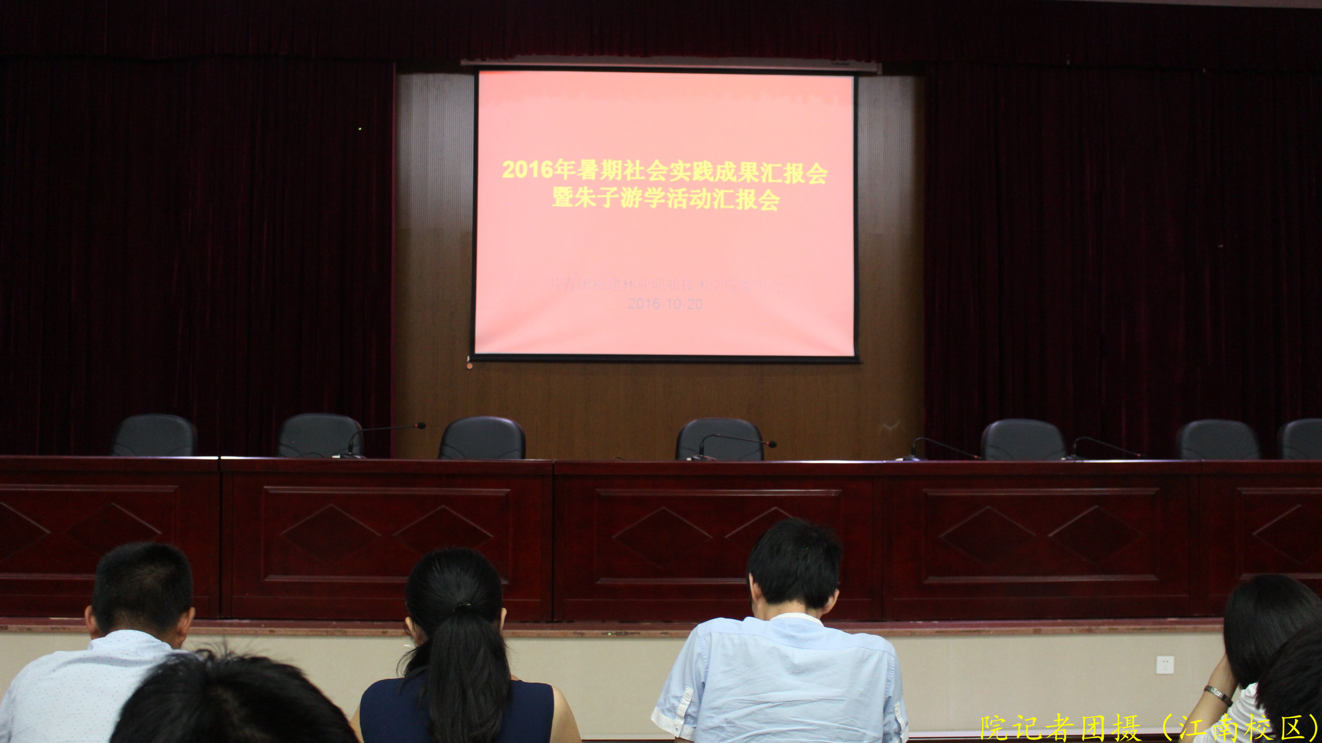 为展示社会实践成果,交流分享实践经验,引导和帮助广大青年学生在社会实践中受教育、长才干、作贡献,2016年10月20日晚上7点30分,院团委在江南校区礼堂隆重举行了2016年暑期社会实践成果汇报会暨朱子游学活动汇报会,团委副书记李霞老师、经济管理系学生科长陈友益老师、艺术设计系学生科长杨自绍老师、各系团总支负责人、各系小分队成员及各系观摩学生等约300人出席此次活动,会议有团委叶新颖老师主持。