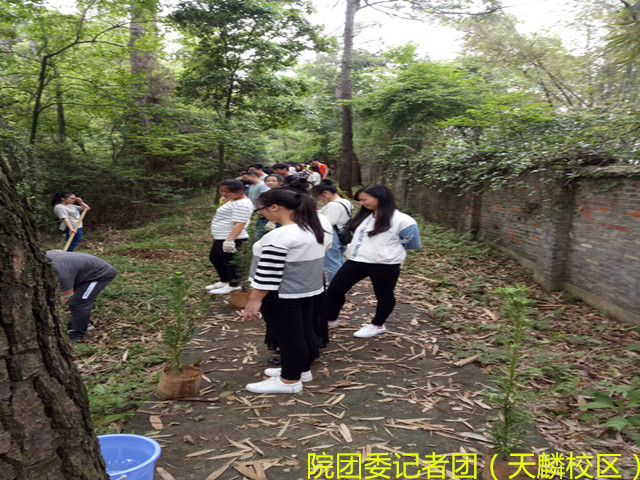 在报名节束后,每个小组挑选了自己喜欢的树苗。接着在宣传横幅上签上名字,并拍合照留影纪念,随后前往天麟山上栽种树苗。在植树现场,大家拿起铁锹、锄头开始埋头植树。有的挥锹铲土、有的扶树填土、有的培土浇水,大家互相配合,循序渐进。经过一个多小时的劳动,罗汉松和山樱花的幼苗在天麟山上“安家落户”,为那里添上了一片新绿。大家植树完后虽然气喘吁吁、汗流浃背,但从他们脸上看也是乐在其中、不枉此行。经过这次身体力行的植树活动也让同学们为绿化校园,保护环境献出自己的一份绵薄之力。