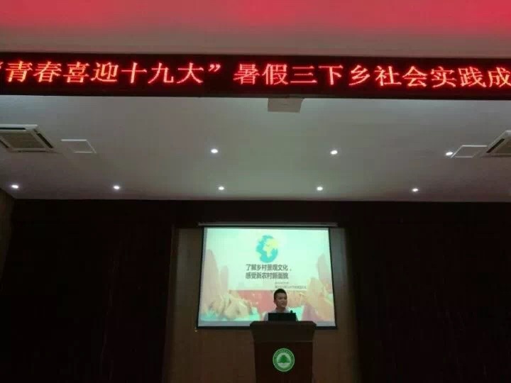 为促进我院学生全面成长成才,喜迎党的十九大胜利召开,2017年10月17日晚7时,院团委在江南礼堂组织开展了以 “青春喜迎十九大”为主题的暑期三下乡社会实践成果汇报分享会,院党委副书记陈洪尧亲临现场并发表重要讲话。林学系党总支书记吴奇镇、建筑工程系党总支书记王云彪、艺术设计系党总支书记、系主任成榕、经济管理系党总支书记谢福荣、自动化工程系党总支副书记范有福、园林系党总支副书记陈剑勇、学生处副处长、团委副书记李霞及各系团总支负责人,各实践队指导老师、各系学生代表共三百余人参加了此次活动。