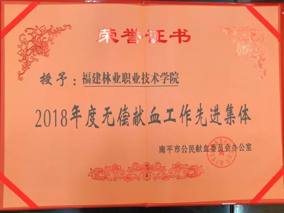 日前,福建林业职业技术学院荣获2018-2019年度全国无偿献血促进奖,由国家卫生健康委员会与中国红十字会总会、中央军委后勤保障部卫生局联合表彰,已在国家卫生健康委员会网站公示。全国共表彰2018-2019年度无偿献血促进奖单位449个,其中福建省12个,福建林业职业技术学院位列其中。