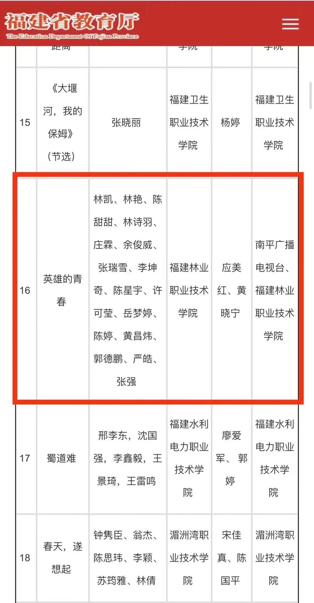 近日,根据《福建省教育厅福建省语言文字工作委员会关于举办福建省第四届中华经典诵写讲大赛及组织参加国赛的通知》要求,经专家评审,我院由应美红、黄晓宁两位老师指导的参赛作品《英雄的青春》在福建省决赛(职业院校组)60支强队中脱颖而出,获得晋级国赛资格,入围教育部第四届中华经典诵写讲大赛“诵读中国”诵读大赛,该作品参演有林凯、林艳、陈甜甜、林诗羽、庄霖、余俊威、张瑞雪、李坤奇、陈星宇、许可莹、岳梦婷、陈婷、黄昌炜、郭德鹏、严皓、张强等16位主持朗诵队的同学。