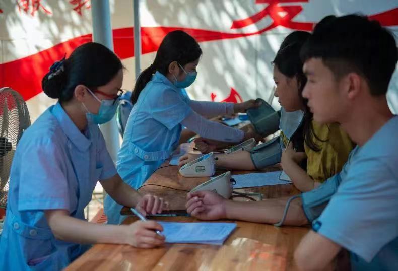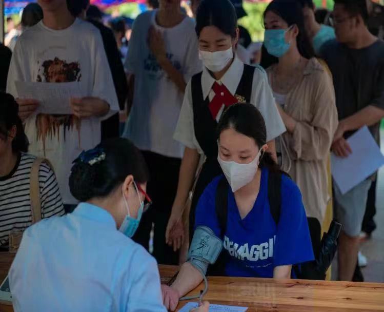 正式抽血之前,工作人员引导献血者填写健康情况征询表,为了确保每位同学的身体状况适合献血,医生为参与献血的学生进行基本的体检。(量血压、测心率、采集血样)