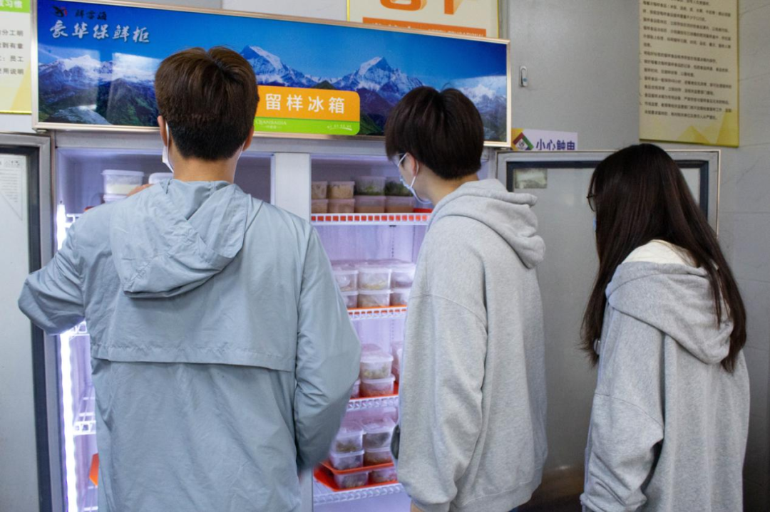 在这里,同学们可以看到留样冰箱,每样菜品售卖前都会留样,每份样品均标注了样品名、时间、负责人,以供随时接受检验。
