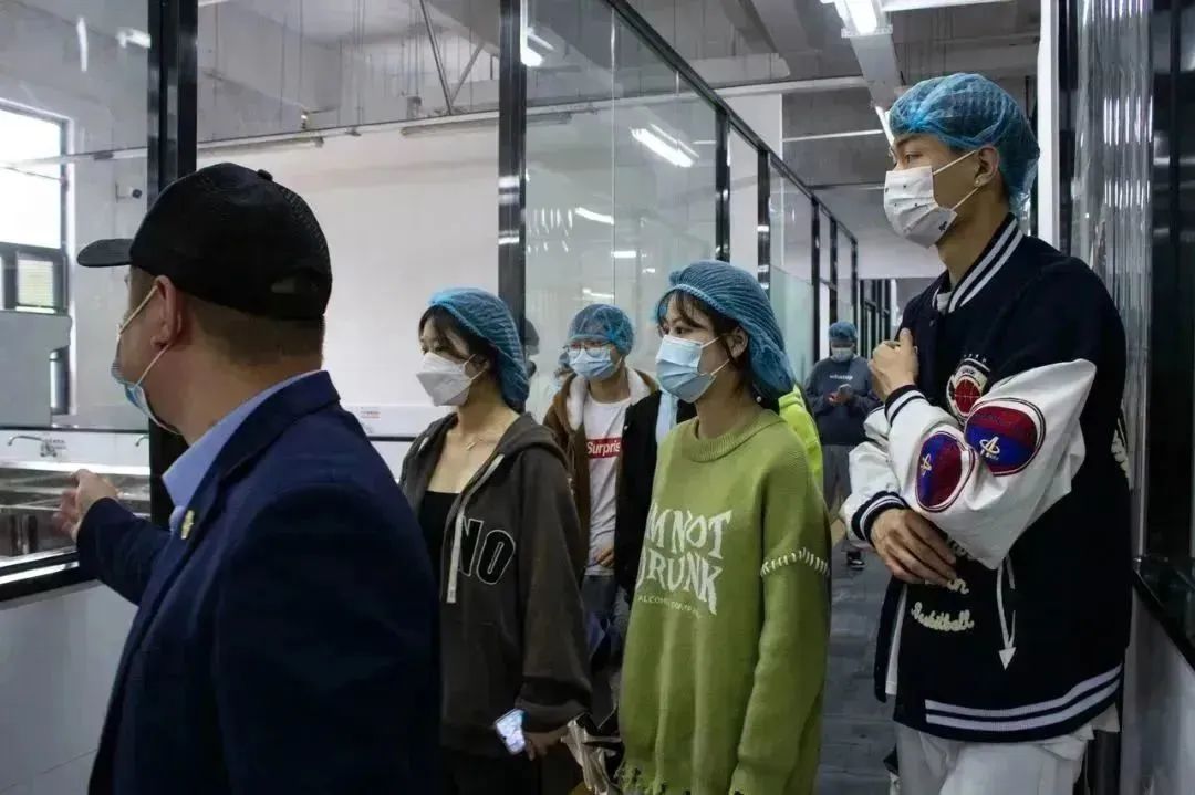 在签到后,50位学生代表统一戴好口罩,在后勤工作人员带领下,实地参观了食堂后厨加工间、备餐间、库房、米饭生产线、肉类集中加工中心等,详细了解了食堂辅料存储、餐具消毒、饭菜加工、食品留样等情况,对食堂的环境卫生和运营管理表达了高度认可和肯定。