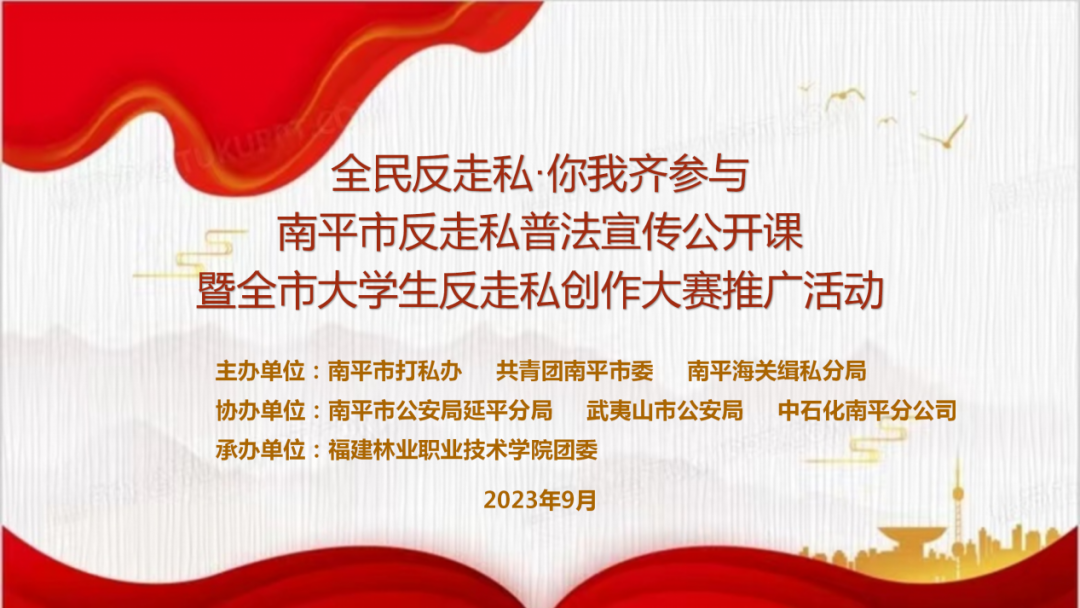 为深入贯彻落实国家、省、市打私办关于反走私宣传工作的部署要求,进一步推进反走私普法宣传工作,提高全民特别是大学生群体的反走私意识,引导青少年树立正确价值观。2023年9月13日上午,由南平市打私办公室、共青团南平市委、南平海关缉私分局主办,福建林业职业技术学院承办的《全民反走私·你我齐参与——南平市反走私普法宣传公开课暨全市大学生反走私创作大赛推广活动》在我院江南礼堂隆重举行。