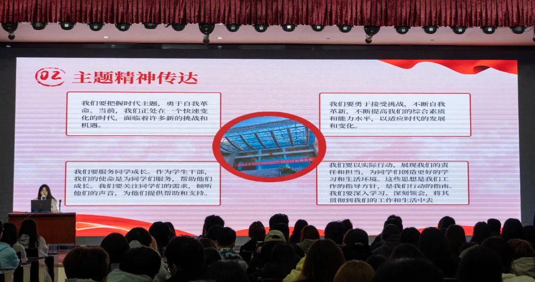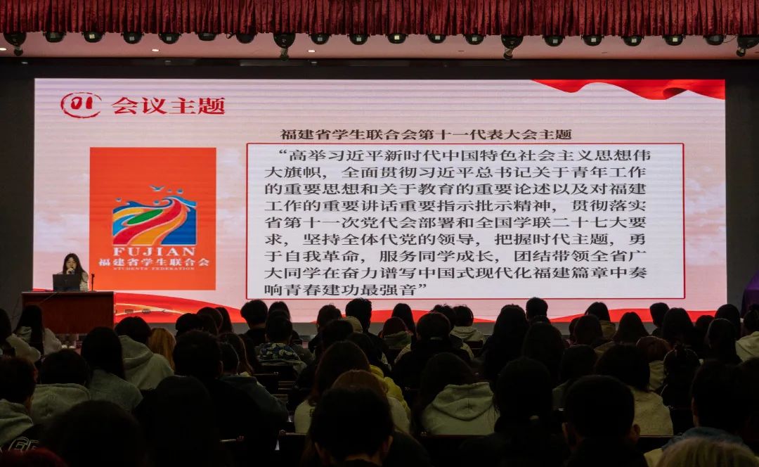 为进一步深入学习领会省学联第十一次代表大会精神,切实加强我院学生会内涵建设,不断提升服务全校学生能力。2023年11月16日下午,组织我院学生会在江南校区礼堂开展省学联十一大会议精神主题学习会,会议由院主席团成员丁慧琳主持,院系学生会骨干近200人参加此次学习活动。