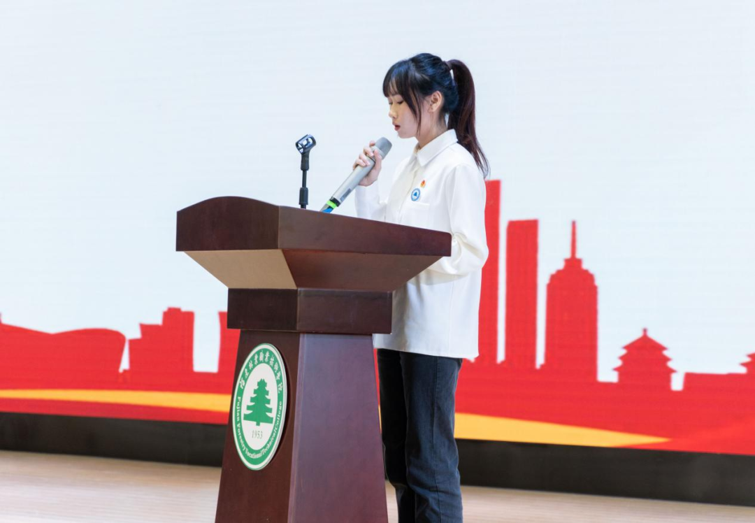 院团委组织部部长欧晓钖同学作为老团员代表发言,她希望新团员们能够谨记入团誓词,切实履行团员权利和义务,时刻以团员标准严格要求自己,努力成为一名优秀的共青团员。并提出以下三点要求:一、不断继承和发扬中华民族的优良传统,努力培养时代责任意识和家国情怀;二、珍惜大学时光,勤奋学习,努力提高自身综合能力与专业知识素养;三、诚信做人,自强不息,努力加强自身道德修养。