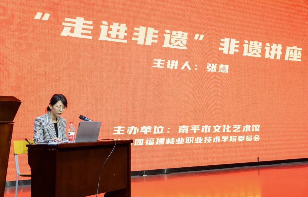 为弘扬中华优秀传统文化,丰富校园文化生活,加大南平非遗文化传播,提升学生综合素养。2023年12月13日下午15:00,由南平市文化艺术馆与福建林业职业技术学院团委联合主办的“走进非遗 (非物质文化遗产)"专题讲座在我院江南校区礼堂成功开展。讲座由南平市非物质文化遗产保护中心副主任、副研究员张慧老师主讲,我院师生代表两百余人到场聆听,院团委王美惠子老师主持本次讲座。