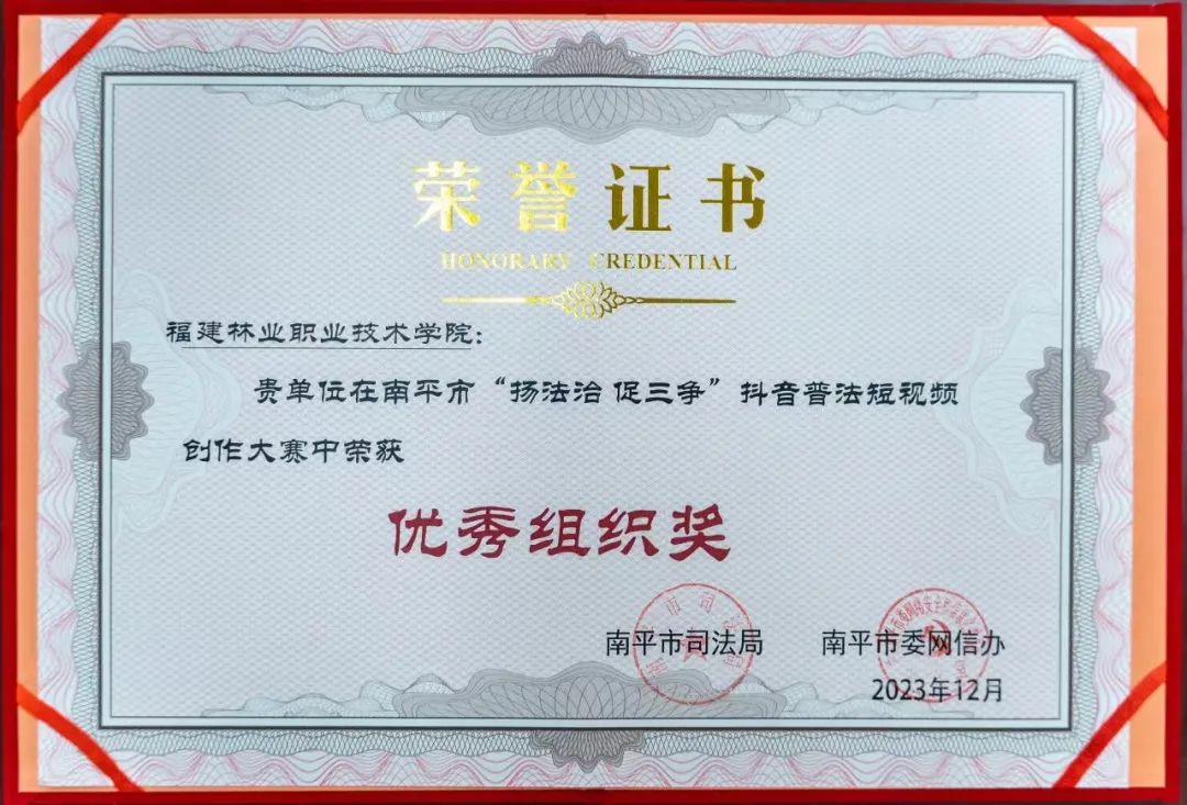 近日,由中共南平市委全面依法治市委员会守法普法协调小组、南平市司法局、南平市委网信办联合举办的“扬法治 促三争”抖音普法短视频创作大赛落下帷幕。本次大赛以短视频为表现形式,以抖音为主要传播平台,以普法为重点主题,旨在结合省委“三争”行动 和市委“五增”目标,弘扬宪法精神,传播法治理念。自活动开展以来,我院团委高度重视,科学谋划,精心组织,围绕着“扬法制 促三争”主题,通过线上线下多维度宣传及组织,选送了一批优秀作品参赛,其中选送作品《隐忍·呐喊》获优秀奖,我院获得南平市“扬法治 促三争”抖音普法短视频创作大赛“优秀组织奖”。