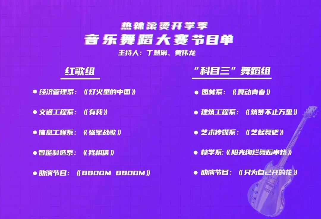 本次音乐舞蹈大赛以“热辣滚烫开学季”为主题,分为红歌组和“科目三”舞蹈组两个部分。各系比赛队伍经过长时间的认真准备,为我们带来了精彩非凡的节目,充分地展现了林职学子的卓越风采。