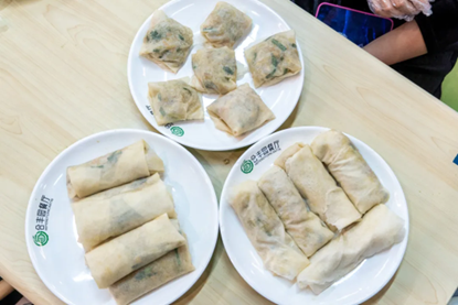 到了美食展示的环节。随着时间的流逝,小小的青团和润饼不断制作完成。同学们纷纷展示着独属于自己的“小团子”和润饼塔。