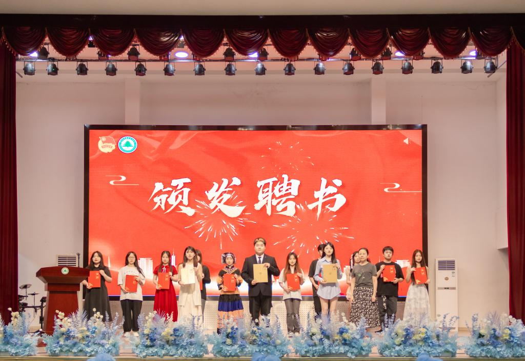 在高亢的《光荣啊,中国共青团》歌声中本次表彰大会拉开了帷幕!随后,经济管理系党总支副书记(主持工作)王昉、院团委副书记(主持工作)雷栩艺为天麟艺术团各队伍负责人颁发聘书;经济管理系主任林文胜为天麟艺术团团长、副团长颁发聘书。
