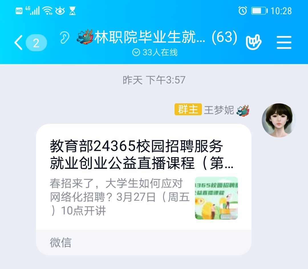 为坚决贯彻党中央关于打赢新型冠状病毒感染肺炎疫情防控阻击战的决策部署,围绕“稳就业”大局,切实做好疫情防控期间毕业生就业服务工作,福建林业职业技术学院招生就业办公室、院团委积极开展福建省共青团”千校万岗“线上就业服务季活动,积极利用新职业网、抖音、荔枝微课、钉钉等平台发动广大毕业生进行网上学习就业课程。