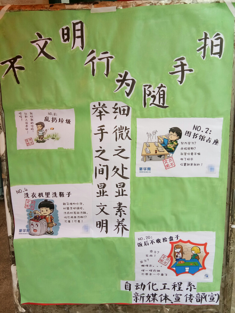 为积极响应学院“大学生文明行为养成教育”的开展,3月16日到31日自动化工程系新媒体中心联合宣传部共同举办了“校园文明与不文明行为随手拍”活动,活动围绕“校园文明、教室文明、宿舍文明、网络文明和食堂文明”等方向展开。