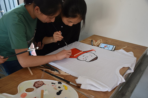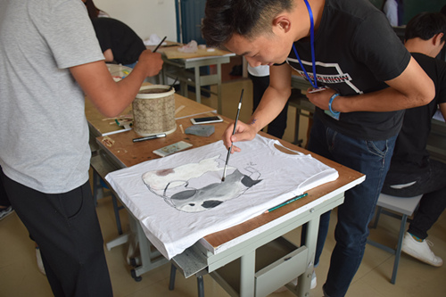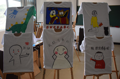 赛场上,选手们挥动手中的画笔,聚精会神地构图、勾边、填色,在洁白的T恤上开始了创意之旅,有生动形象的动漫人物,有活泼可爱的小动物,还有时下流行的搞怪表情包。一件件精美而又趣味十足的T恤,让我们不仅感叹选手们扎实的画工,细腻的心思和奇妙的想象力。在比赛过程中,难免会遇到一些问题,参赛者都互帮互助,相互借画笔、颜料等工具,体现了选手们 “友谊第一,比赛第二”的精神。