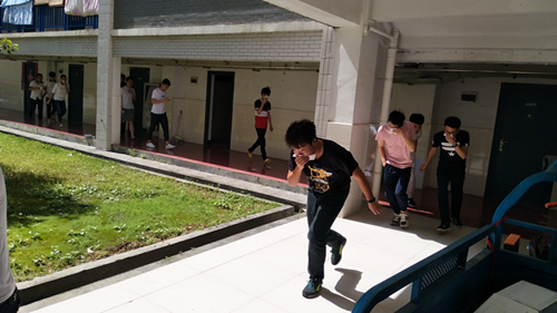 演习在一声哨令下有序进行,总指挥发出疏散信号后各楼层安排吹哨员吹响哨声。演习过程中,同学们听到信号后及时逃生,逃跑救营过程中保持冷静,疏散时用毛巾、袖头等捂住口鼻降低身体高度,按规定线路疏散,在规定的时间范围内到达了人工湖前集合,紧凑有序,此次活动意义深远,较好的达到了预期的演练效果。