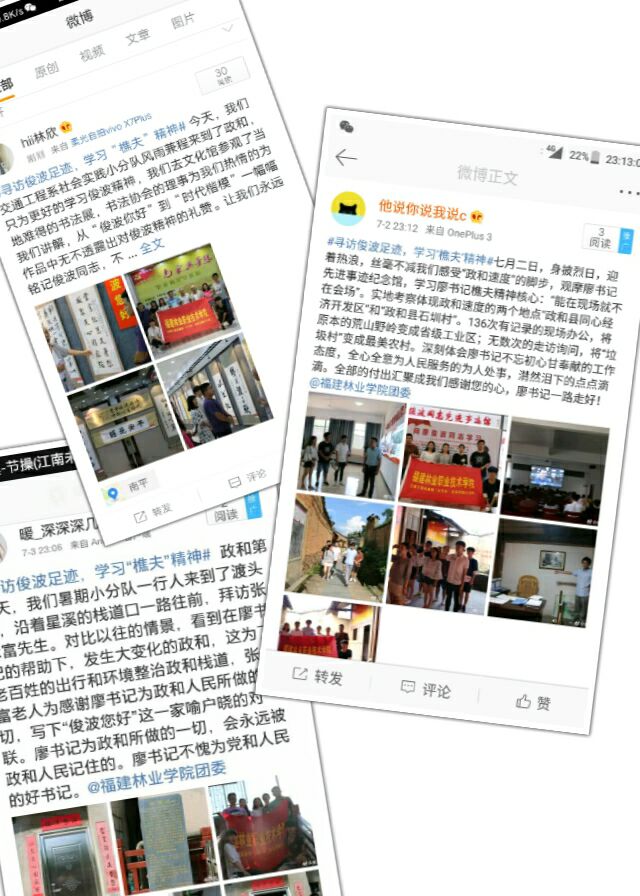 为深入贯彻落实习近平总书记对廖俊波同志先进事迹作出的重要指示精神、中共中央《关于认真学习贯彻习近平总书记重要指示精神广泛开展向廖俊波同志学习的通知》文件精神和刘云山同志在福建调研时的重要讲话精神,多形式学习和大力弘扬廖俊波同志崇高精神,交通工程系学习俊波精神社情观察团开展了以“寻访俊波足迹,学习“樵夫”精神”为主题的暑期社会实践活动。