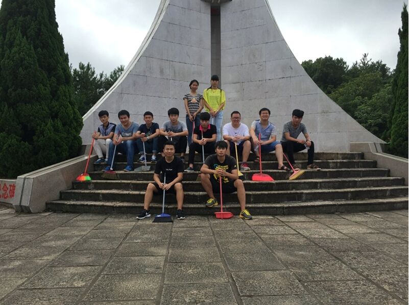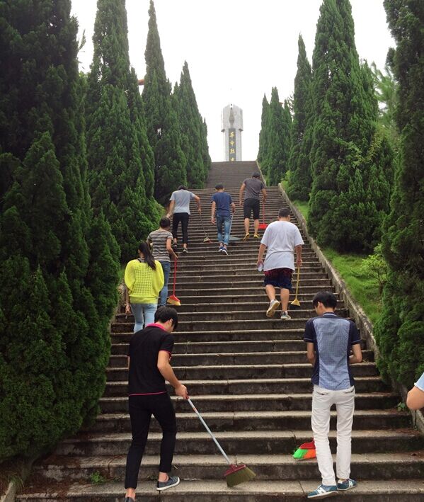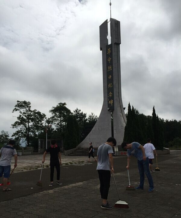 为纪念中国人民抗日战争暨世界反法西斯战争七十周年, 2015年9月3日早上8点半,自动化工程系团总支组织学生分会干部到九峰山革命烈士纪念碑开展清理杂草、沙土,打扫垃圾志愿服务,使纪念碑面貌焕然一新。