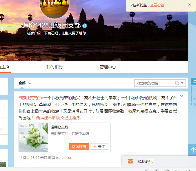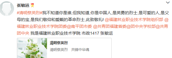 4月3日,交通工程系各团支部在新浪、腾讯微博平台发起#清明祭英烈#话题讨论,发动团员青年积极参与,留言写下对英烈的缅怀和敬仰,在网上开展了以“清明祭英烈 共铸中华魂”为主题的宣传活动。
