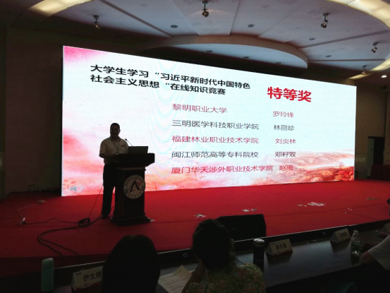 会议共分为三个议程:名师工作室领衔名师论坛、马克思主义学院院长论坛、在线知识竞赛。名师工作室领衔名师论坛上,上海市、广东、湖南、四川和福建省思政课教学名师做了主题报告。在福建省高职院校大学生学习“习近平新时代中国特色社会主义思想”在线知识竞赛现场赛及颁奖仪式上,我院“青马社”学员刘炎林同学表现优异,在24个院校代表队进行的现场竞赛角逐中,获第三名。在此次福建省高职院校大学生学习“习近平新时代中国特色社会主义思想”在线知识竞赛中,我院从“青年马克思主义读书社”中选派23位学员参赛,22位同学获奖,其中,刘炎林同学荣获特等奖,李建晨、邓玉洪、陈添煜等11位同学荣获二等奖;傅汉强、吴洋、董永亮等8位同学荣获三等奖;甘沁、范仕锦2位同学获优胜奖;杜彩银、李玲老师获优秀指导老师奖。
