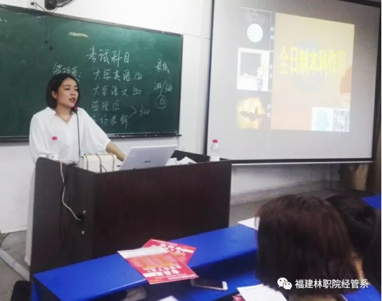 唐老师对专升本目前的基本状况、专升本的要求、资格及各项准备工作向同学一一作了具体介绍,她鼓励同学积极参加专升本的考试,进一步提高自己的专业理论水平和学历,为自己今后的职业生涯打好坚实的基础,通过这次讲座,同学们感悟良生似乎又找到了一个人生目标新起点新征程。