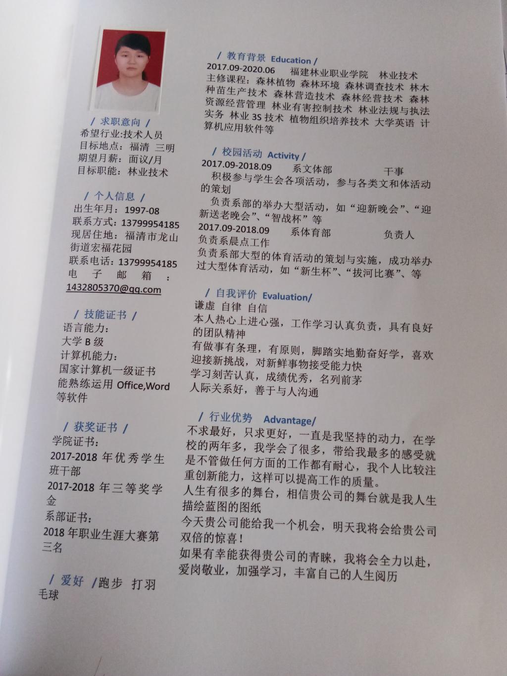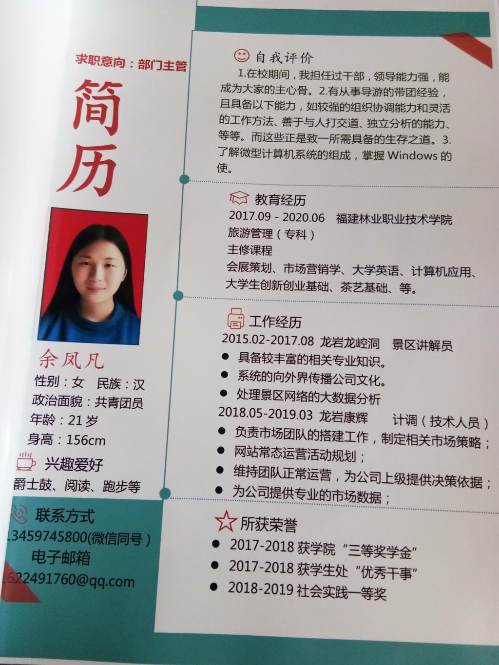 一份好的、醒目的简历,能够更好的吸引面试官的眼球。最终我系共有6位同学脱颖而出,取得佳绩。获奖名单如下:旅游管理1712班余凤凡同学荣获一等奖,旅游管理1802班陈政顺同学以及林业技术1728班张冰芳同学荣获二等奖,食品营养与检测1710黄淳婧同学、林业技术1733班张梦林同学和林业技术1728班林怡倩同学并列荣获三等奖。