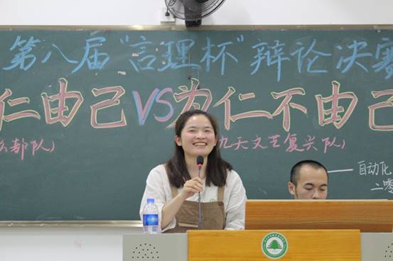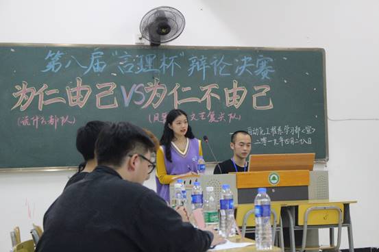 在两队简单的自我介绍后,比赛正式开始,双方就辩题“为仁由己还是为人不由己”展开辩论,正方计算机1804班的观点是“为仁由己”,反方软件1801班的观点是“为仁不由己”。本次“为仁由己”辩题的典故是出自《论语·颜渊》的:“克己复礼为仁。一日克己复礼,天下归仁焉。为仁由己,而由人乎哉?”意思是实行仁德,完全在于自己。