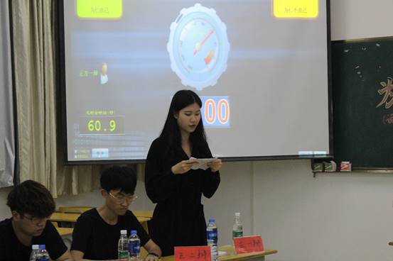 正方三辩和二辩在反方的个个辩手逐一攻击提问的情况下,以清晰的逻辑能力和灵活的反应能力防御了反方,正方士气大增,个个充满了信心乘胜追击,场下的评委和观众都为之拍手叫好。