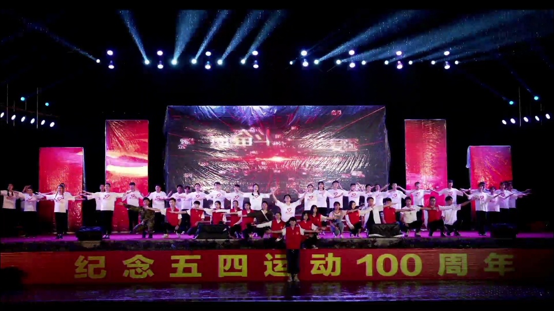 晚会5月5日晚7点30正式开始,早在前几天,准备工作就在紧张有序中进行,表演者们在舞台上一遍又一遍的排练着,志愿者们组织发放盒饭,做好后勤保障工作,两委会干部牺牲午休时间在操场将椅子排整齐,当晚下着雨,1800名观众、500多位演职人员、上百名志愿者的热情丝毫没有被这突如其来的雨水浇灭,热血澎湃的青年表演者在舞台上尽情的展现自我,两委会的干部们在雨中维持着秩序,场下的同学们挥舞着国旗为青春与祖国呐喊助威,现场一片欢腾,在场的同学们齐唱《共青团团歌》并集体宣誓,表达了我们同学对祖国的热爱,和作为一个青年团员的责任与使命。