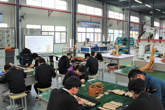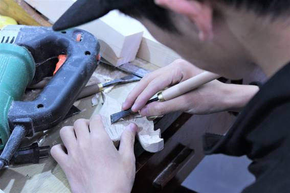 当我们步入实训室中,映入眼帘的是同学们对着各式各样的木材,埋头认真创作练习的场景。