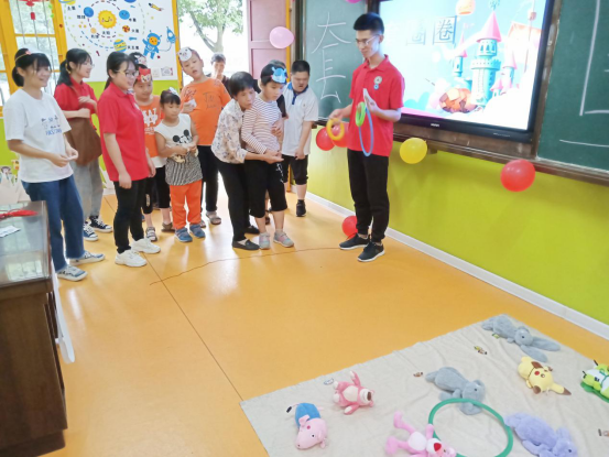 本次的活动是由各个教室的小游戏以“开火车”的形式一个接着一个进行,小朋友每完成一个游戏会给予贴纸。“贴鼻子”锻炼小朋友们的临时记忆力、“巧手拼”训练小朋友们快速动手能力,在“套圈圈”的游戏中希望套中的兴奋和套中的喜悦洋溢在这个小小的教室中。随着各种游戏的结束志愿者们将孩子们带到多媒体教室里集合共同唱了一首《一闪一闪亮晶晶》,孩子们真挚的歌声和志愿者们真诚的歌声融合在一起构成美妙的旋律。最后志愿者们将自己精心制作的礼品送给孩子们祝他们“六一”快乐并且一起合影留念,活动在欢声笑语中圆满结束。