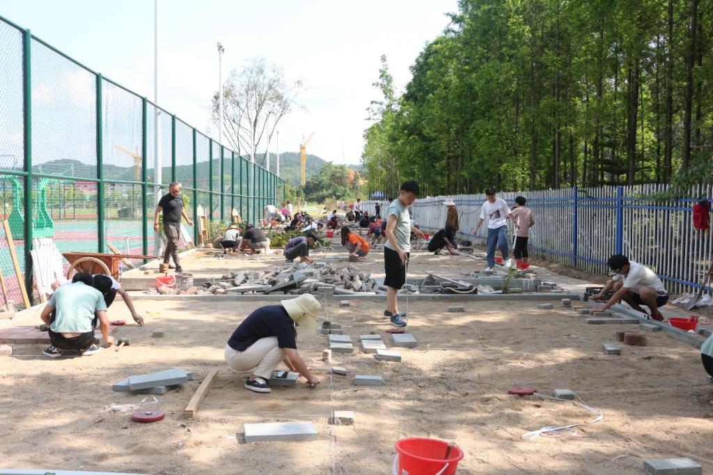 本赛项为2人小组赛,一块景观沙池划成四块供四个小组施工做自己的做品。随着比赛时间一到各个小组纷纷拿起皮尺、卷尺开始测量出自己施工园路的范围,确认好范围便开始施工,展示自己的风采。在赛场上有老师会负责对学子进行监督,也会为学子提供帮助,解答学子疑问。学子们手起锤落铺好一块块砖,一步步完成自己的创造,与时间竞速,与太阳争辉。
