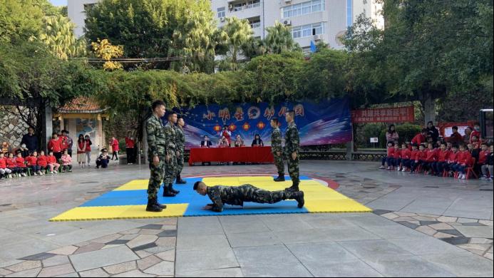 来自我院交通工程系的退伍士兵动作精炼,节奏分明,帅气的军装,飒爽的英姿,饱满激昂的气势,淋漓尽致的展现出了军人的风貌,贯耳冲膝、抓腕砸肘,随着一声声的口令,拳拳生风,犹如出海蛟龙,下山猛虎,紧紧吸引着孩子们的目光,迎来幼儿们的热烈喝彩。在互动环节,着迷彩妆的孩子们脸上洋溢着兴奋与喜悦,在教官的指导下进行一系列的军姿队列训练,身躯在站军姿时同样笔挺,在卧倒时同样神情坚定,在匍匐前进时亦是有模有样……在教官和孩子们的对歌环节,现场气氛达到高潮,此起彼伏的歌声,稚嫩、嘹亮的的声音,响彻全场,饱含着孩子们积极向上的力量!