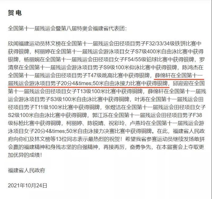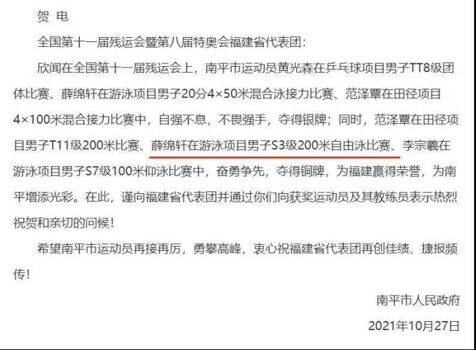 据悉,此前,福建省人民政府、南平市人民政府向薛绵轩等发出贺电;政和县委主要领导来到薛绵轩家中,与他进行亲切交流,了解他家庭生活和学习、训练情况,并送上慰问金。明天,他还将出发省残疾人体育运动管理中心,参加东京残奥会陕西残特奥会福建总结表彰活动,届时尹力书记、赵龙省长等省领导将出席相关活动。