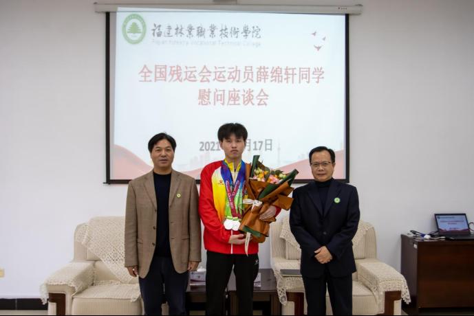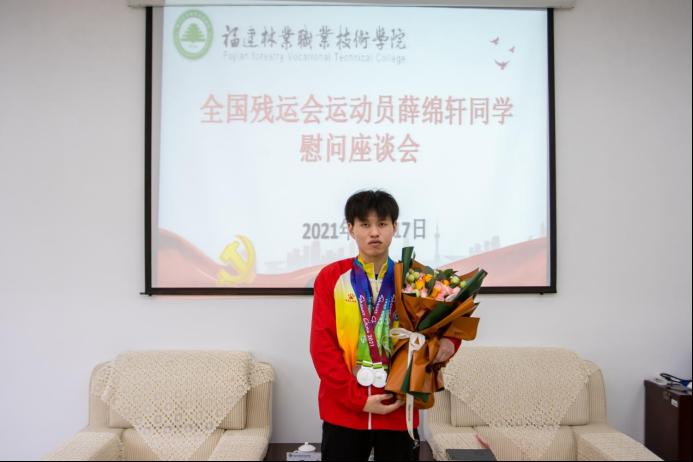 薛绵轩平和而低调,阳光而乐观。他说,感谢游泳,让他在不同的赛场重新认识了自己。很遗憾没获得金牌,在今后会更加努力刻苦训练,实现自己的梦想和价值。从赛场重返校园,深切感受到林职院师生的关心和热情,在学校的学习生活各方面都很适应,下一步他将以更加积极向上的心态迎接新的挑战,争取在更高的赛场上,为家乡、为学校、为国家再添光彩!