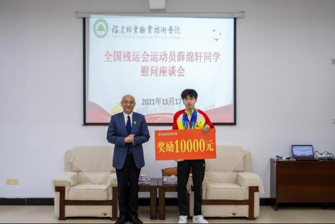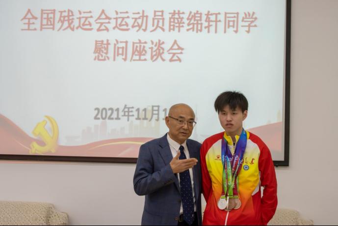 薛绵轩返校之际,信息工程系党总支副书记(主持工作)罗志斌、辅导员洪其双即刻前往薛绵轩宿舍看望慰问。罗书记关心询问了他在生活、学习、训练上情况。对他努力拼搏、积极进取的运动精神给予高度评价,希望他能够继续发扬刻苦训练精神、继续努力,在日后的比赛中再创佳绩,为校争光。同时他表示信息工程系党总支将认真贯彻座谈会精神,按照院党委万泉书记的要求,提炼总结好薛绵轩同学的先进事迹,在系部学生中掀起开展向薛绵轩同学学习的热潮。系党总支将在思想上、生活上更加关心薛绵轩同学,切实解决实际困难和后顾之忧,为薛绵轩同学更好的为学校、国家再创佳绩提供坚强的保障。信息工程系主任华建祥表示,信息工程系协调专业课教师将采用线上线下学习与集中辅导相结合的方式,为薛绵轩同学及时补上因备战全国第十一届残运会落下的课程,确保专业学习不落下。