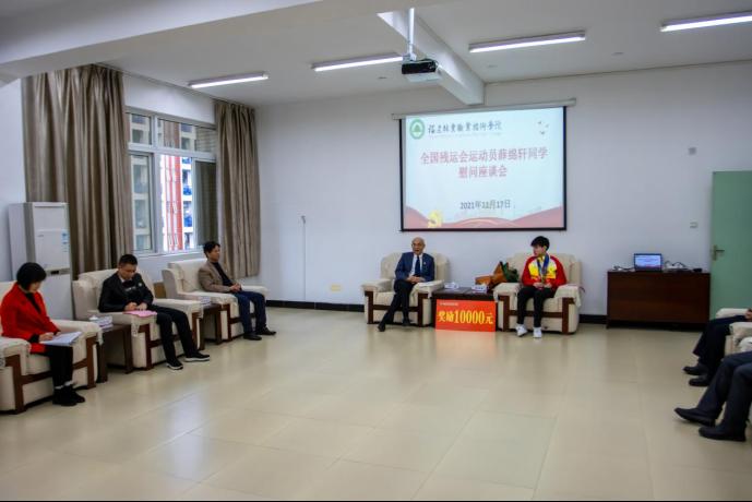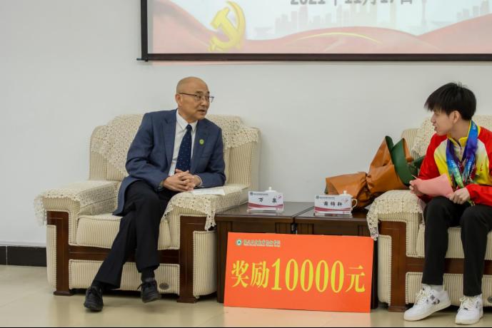 万书记向他提出期望,希望他下一步能把自己奋斗拼搏的故事提炼总结,在同学中讲好自己的故事,树立同学身边的榜样典型,充分展现自己的奋斗精神和国家的文明进步。同时能继续完成好学习任务,做到体育锻炼、专业学习两不误。最后万书记承诺学院新建成的游泳馆将永远对他免费敞开,为他创造集训条件,争取取得更大成绩,为学院、为家乡、为福建争光。